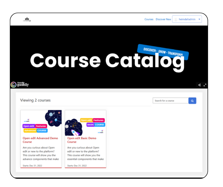 Visitors can browse the homepage, the course catalog, and some additional static pages, to find all the general information about the online learning initiative and its offering.