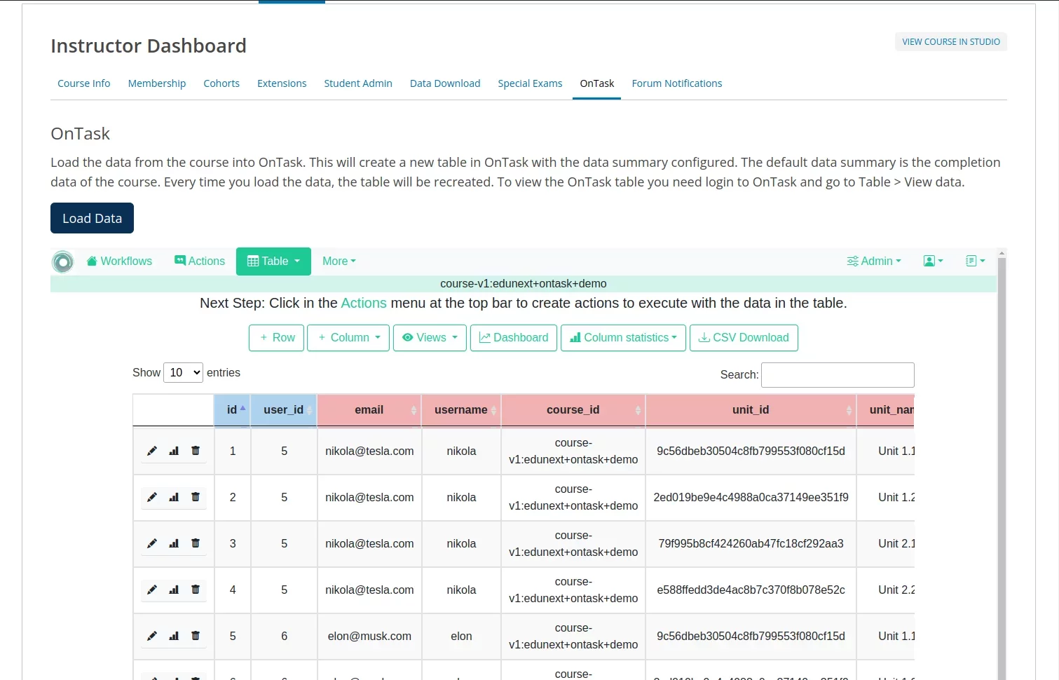 An Open edX plugin that adds a new tab to the instructor dashboard, providing easy access to the OnTask service (an open-source project for delivering automated personalized feedback). The plugin also includes an API to create a new workflow and table in OnTask based on course data. As part of this effort, eduNEXT also developed a Tutor plugin for deploying the OnTask platform alongside the Open edX instance.